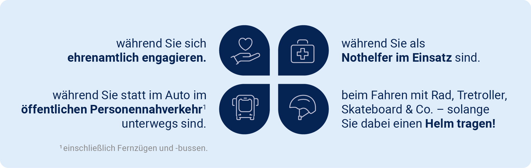 Auf Reisen Neues entdecken, mit Sport fit bleiben und das Beste aus dem Hier und Jetzt machen: Sie genießen es, Ihr Leben spontan und abwechslungsreich zu gestalten. Klar, dass dabei auch mal was passieren kann. Damit Sie sich nach einem Unfall voll und ganz aufs Gesundwerden konzentrieren können, sind zwei Dinge besonders wichtig: zuverlässige Unterstützung und ein finanzieller Puffer, der Ihr Einkommen sichert und mögliche Folgekosten abdeckt.